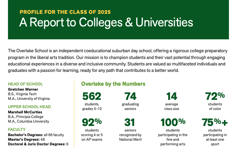 “The purpose of the annual Report to Colleges is to provide an overview about The Overlake School to colleges and universities to which Overlake seniors apply,” explains Kate Asgari, Director of College Counseling. “In addition to materials submitted by a student, each application to a college includes the Report to Colleges, a transcript, and three letters of recommendation, which include a college counselor, a faculty member from the humanities department, and a faculty member from the STEM disciplines.”